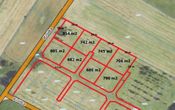 Powierzchnie działek: 682 m², 686 m², 742 m², 745 m², 790 m², 796 m², 805 m², 814 m².