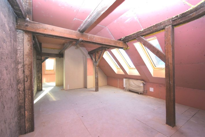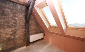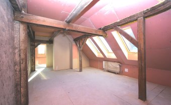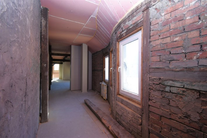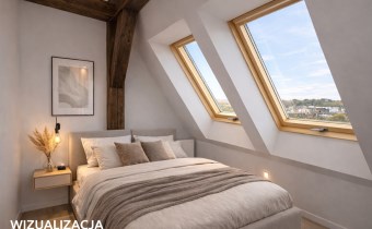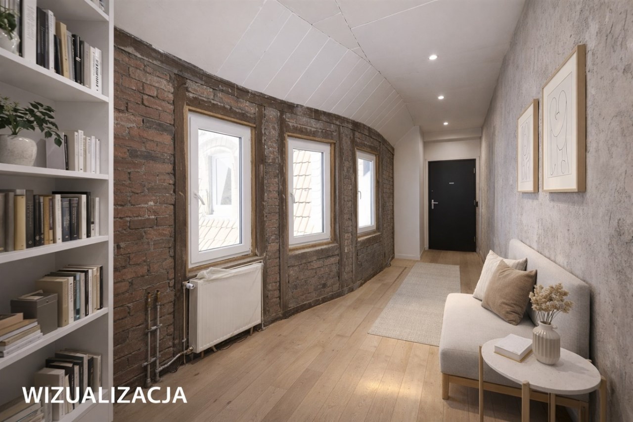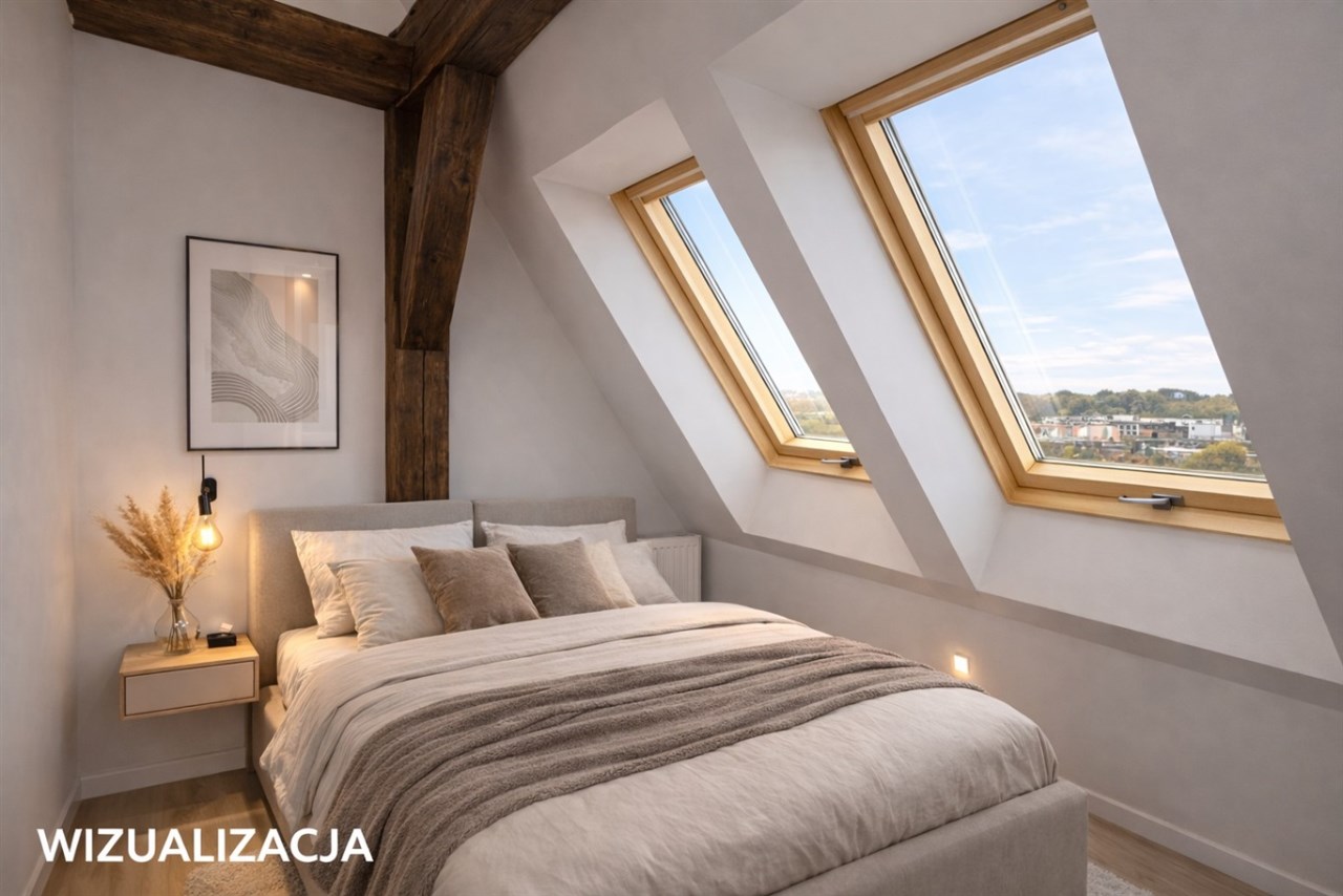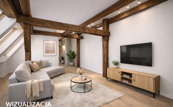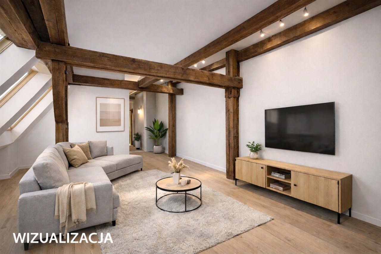 Powierzchnia użytkowa mieszkania wynosi 65,8 m2, natomiast licząc po podłodze – wraz ze skosami – około 72 m2. Wnętrze wyróżnia się niezwykle ciekawą i nietypową architekturą. Znajdują się tu skosy, widoczne drewniane belki oraz filary konstrukcyjne, które nadają mieszkaniu wyjątkowego, loftowego klimatu i tworzą ogromny potencjał aranżacyjny.